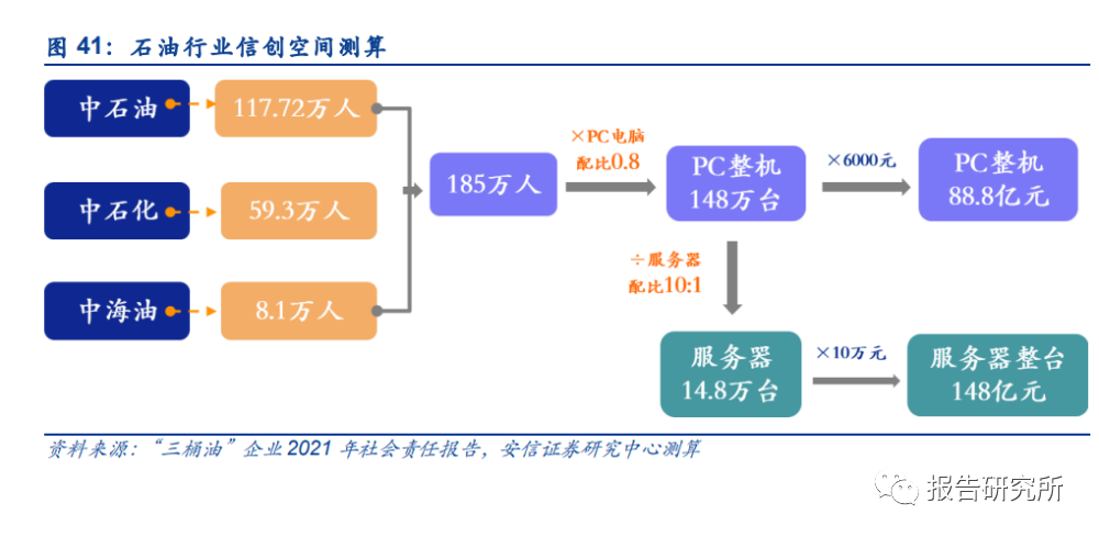“三桶油”在我国石油行业居于垄断地位。根据石油行业市场主体的从业人员数量,假设从 业人员对应 PC 整机的配比为 1:0.8,我们测算石油行业 PC 整机(含软硬件)的需求量约 148 万台,市场空间约 88.8 亿元;服务器的需求量约 14.8 万台,假设 PC 对应服务器的配 比为 10:1,服务器总的市场空间约 148 亿元。