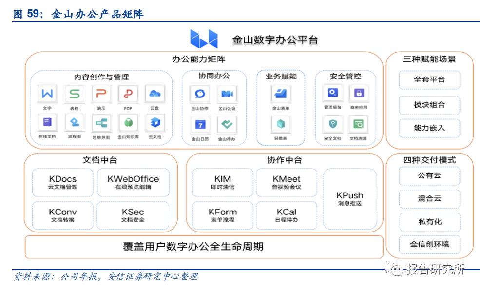 金山办公主要产品包括 WPS Office 办公软件、金山文档等办公能力产品矩阵以及金山数字 办公平台解决方案;主要服务包括基于公司产品为客户提供涉及日常办公和文档相关的增值 功能、互联网广告推广等服务。WPS Office 办公软件为用户提供一站式办公服务,具有强 大兼容性;金山文档是一款支持多人实时协作的在线文档服务;金山数字办公平台是基于金 山办公产品矩阵,进行云化、中台化改造和二次开发后打造的涵盖内容创作与管理、协同办 公等赋能解决方案。