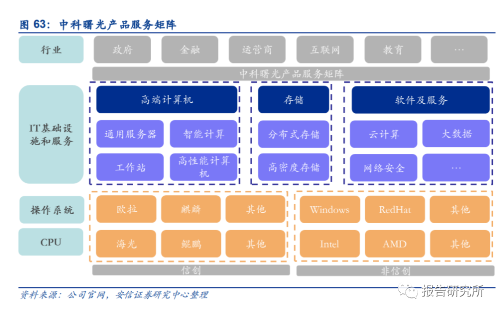 中科曙光主要从事研究、开发、生产制造高性能计算机、通用服务器及存储产品,并围绕高 端计算机提供软件开发、系统集成与技术服务。公司是国内高性能计算领域的领军企业。1998-2008 年间,公司陆续发布曙光 2000 到曙光 5000 系列高端计算机,引领我国先进计 算产业的发展。2014 年公司在上交所上市,通过内延外购的方式提升竞争能力。2014 年投 资海光信息,主打高端处理器产品开发;2016 年投资的中科星图于 2020 年在科创板上市;2018 年子公司曙光节能在新三板上市。经历 20 余年发展,中科曙光在高端计算、存储、安 全、数据中心等领域拥有深厚的技术积淀和领先的市场份额,并充分发挥高端计算优势,布 局智能计算、云计算、大数据等领域的技术研发,打造计算产业生态。