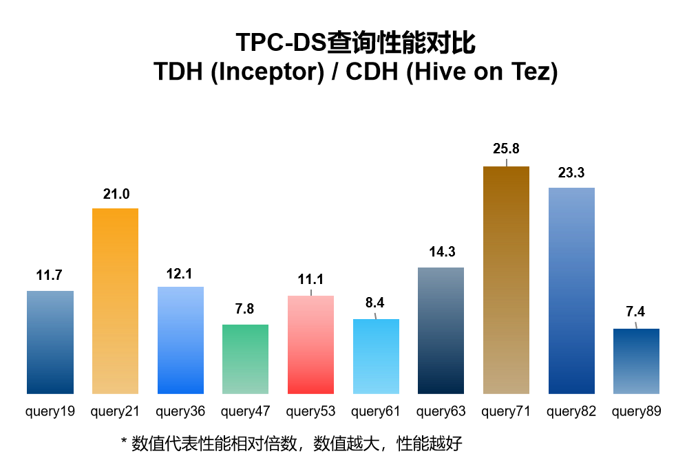 Inceptor是星环科技自主研发的关系型分析引擎,基于TPCDS 1TB的数据规模,同等配置下(4X10cores),基于以下不同查询分析场景下,TDH(inceptor)性能是CDH(Hive on Tez)的7~25倍。
