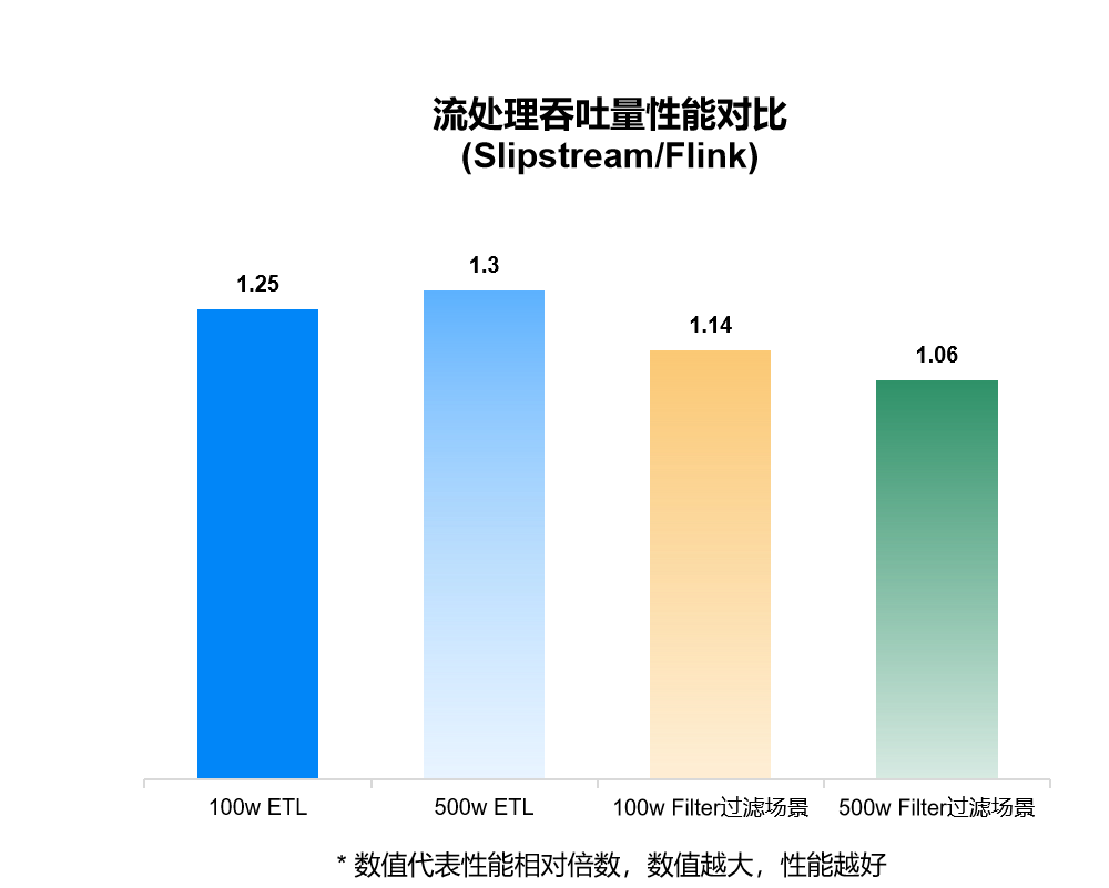 Slipstream是星环科技自主研发的实时流计算引擎,在吞吐量性能方面,ETL测试项100万、500万数据量数据处理吞吐量,Slipstream比Flink性能分别提升25%和30%。Filter过滤场景100万、500万数据量Slipstream比Flink性能提升14%和6%。
