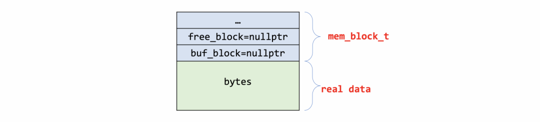 typedef struct mem_block_info_t mem_block_t;typedef mem_block_t mem_heap_t;.../** The info structure stored at the beginning of a heap block */struct mem_block_info_t {...UT_LIST_BASE_NODE_T(mem_block_t) base; /* 链表基节点,只在第一个block定义 */UT_LIST_NODE_T(mem_block_t) list; /* block链表 */ulint len; /*!< 当前block大小 */ulint total_size; /*!< 所有block总大小 */ulint type; /*!< 分配类型 */ulint free; /*!< 当前block的可用位置 */ulint start; /*!< block构建时free的起始位置(没看到较多的用途) */void *free_block; /* 包含有 MEM_HEAP_BTR_SEARCH 类型的heap中,heap root挂着free_block用以申请更多的空间,其他类型该指针为空 */void *buf_block; /* 内存从buffer pool申请,保存buf_block_t指针,否则为空 */};