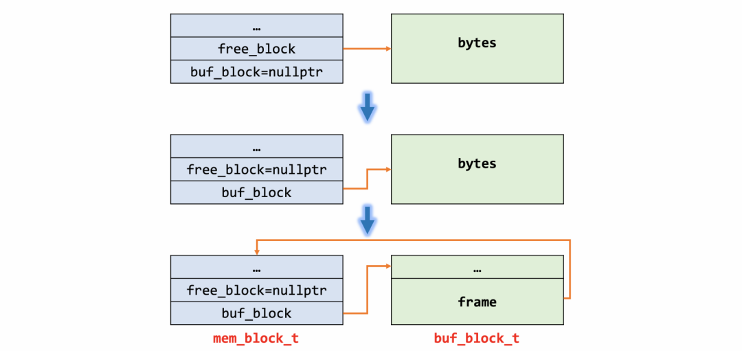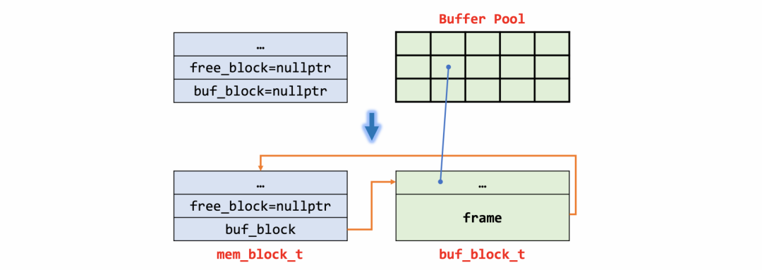 // case 1if (type == MEM_HEAP_DYNAMIC || len < UNIV_PAGE_SIZE / 2) {ut_ad(type == MEM_HEAP_DYNAMIC || n <= MEM_MAX_ALLOC_IN_BUF);block = static_cast<mem_block_t *>(ut_malloc_nokey(len));} else {len = UNIV_PAGE_SIZE;// case 2if ((type & MEM_HEAP_BTR_SEARCH) && heap) {// 从heap root的free_block获取内存buf_block = static_cast<buf_block_t *>(heap->free_block);heap->free_block = nullptr;if (UNIV_UNLIKELY(!buf_block)) {return (nullptr);}} else {// case 3buf_block = buf_block_alloc(nullptr);}block = (mem_block_t *)buf_block->frame;}