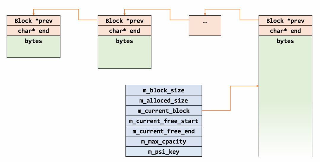Block是其核心结构,所有的内存分配都源自于此。Block中包含了指向前1Block的指针prev,同时保留了end作为地址范围的标志,表明Block所管理的内存范围。 m_block_size记录了MEM_ROOT下一次要分配和管理的Block内存块的总大小,当申请新的Block块时,该值都会更新为原值的1.5倍。 m_allocated_size记录了MEM_ROOT从OS分配出的内存总量,每次分配新的Block时该值也会进行更新。 m_current_block、m_current_free_start、m_current_free_end分别记录了当前管理block的起始地址、空闲地址和结束地址。 m_max_capacity定义了MEM_ROOT的管理的最大内存,m_error_for_capacity_exceeded是内存超出最大限制的控制开关,m_error_handler是内存超出的错误处理函数指针;m_psi_key是PFS内存监测点。