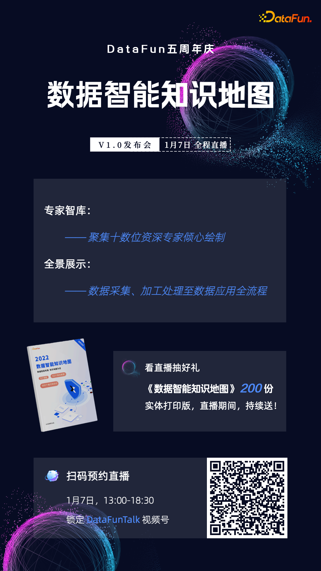 1月7日,13:00-18:30,DataFun将召开数据智能知识地图1.0版本发布会,邀请知识地图的作者们现场为大家进行详细讲解,并畅谈大数据/人工智能从业者的技术路径和职业发展,感兴趣的小伙伴,欢迎点击下方卡片,预约直播!我们同时准备了《数据智能知识地图》 200 份实体打印版,直播期间,持续送,欢迎大家上车!