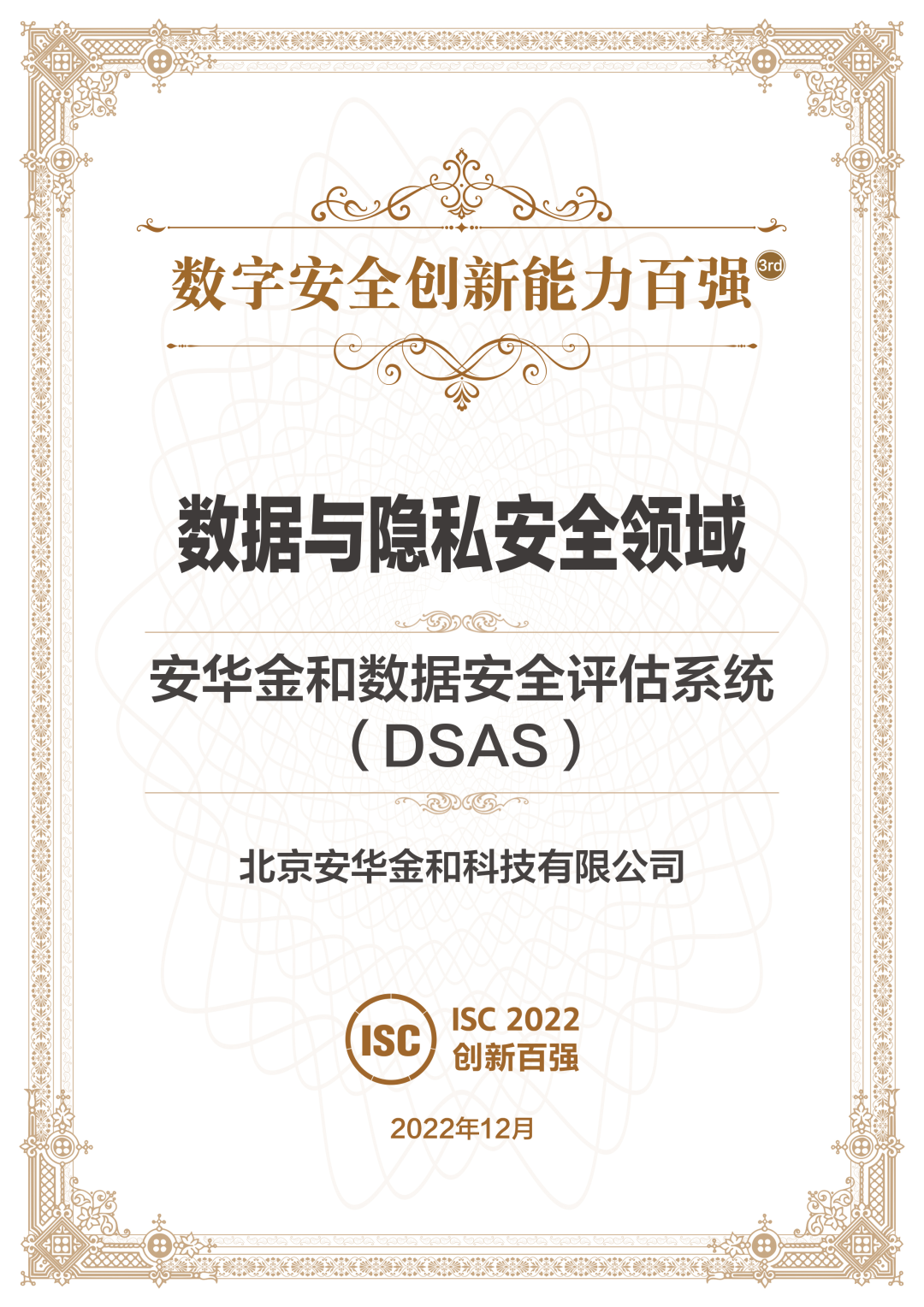 12月21日,ISC 2022数字安全创新能力百强暨数字安全技术创新论坛在北京成功举办。此次评选集聚十大年度热点领域的 200 余家参选企业、600余个安全创新产品及解决方案,安华金和在本次评选中脱颖而出,以数据与隐私安全领域代表厂商身份荣获“ISC 2022数字安全创新能力百强”称号!