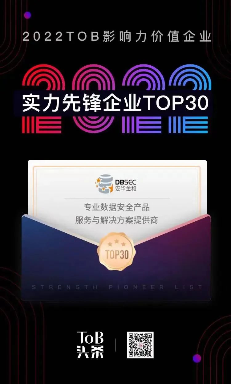 近日,「ToB行业头条」联手3W集团正式发布了《2022中国ToB行业年度调研·实力先锋企业》。安华金和凭借在数据安全领域的技术创新力、市场服务能力和持续发展能力,以垂直行业领导者之姿,荣登“2022ToB行业实力先锋企业榜单”,企业影响力再获市场认可。