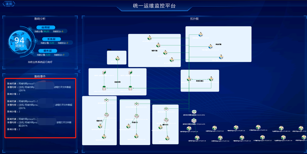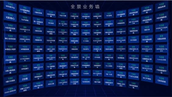 全景业务墙可以汇总展示公司内部重点业务系统及其业务健康度,可下钻查看详细异常节点、详细指标及告警信息等。将关键的业务系统配置到全景业务墙上,通过对每个业务系统下钻,用户可查看到对应的的整体业务状态,包括业务拓扑图、健康度影响分析、影响的告警事件,方便用户了解业务系统的物理层、中间层、应用层实际运行状况,做好关键业务系统的优化、保障工作常态化开展。