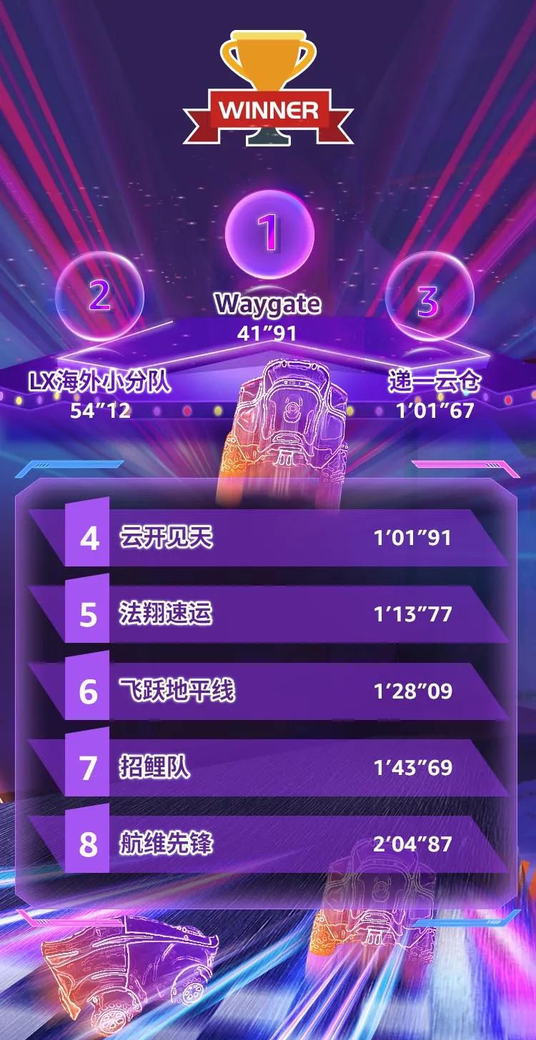 最终有 3 支实力超群的参赛队伍脱颖而出,Waygate 以 41″91 的成绩荣登冠军宝座,LX 海外小分队以 54″12 的成绩斩获亚军,递一云仓以 1′01″67 夺得季军,他们的出色表现赢得了全场的喝彩,祝贺他们!