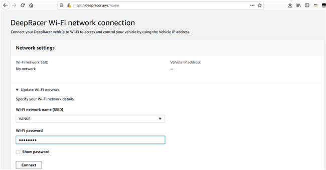 通过 USB 线登录赛车的设备控制台 https://deepracer.aws,选择能够连接公共网络的 WiFi 路由器,输入 WiFi SSID、密码、连接。