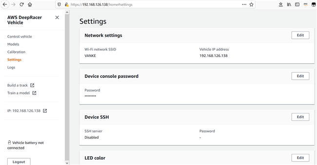 在赛车设备控制台中选择 Setting、Device SSH、Edit、修改 SSH 密码。