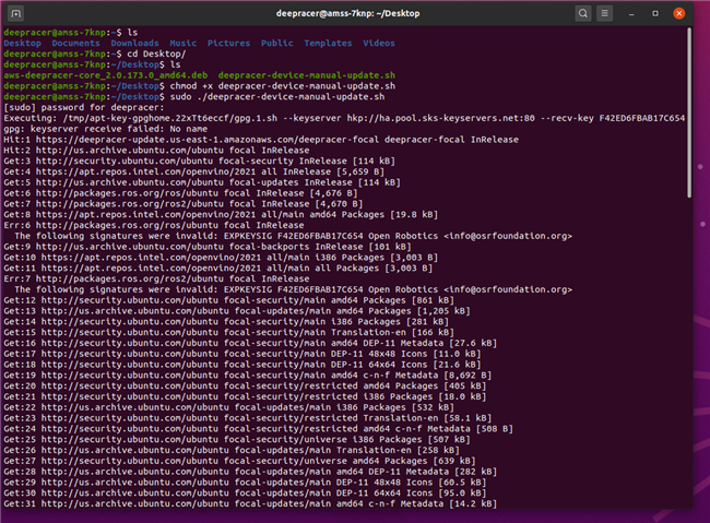 步骤 b,在 deepracer-device-manual-update.sh 中增加语句:sudo sh -c 'echo "deb http://packages.ros.org/ros/ubuntu $(lsb_release -sc) main" > etc/apt/sources.list.d/ros-latest.list'sudo apt-key adv --keyserver hkp://ha.pool.sks-keyservers.net:80 --recv-key F42ED6FBAB17C654sudo cp aws-deepracer-core_2.0.173.0_amd64.deb var/cache/apt/archives/sudo dpkg -i aws-deepracer-core_2.0.173.0_amd64.debsudo apt-get install aws-deepracer-core步骤 c,将修改后的 deepracer-device-manual-update.sh 以及下载的 aws-deepracer-core_2.0.173.0_amd64.deb 复制到赛车操作系统的桌面。chmod +x deepracer-device-manual-update.shsudo ./deepracer-device-manual-update.sh