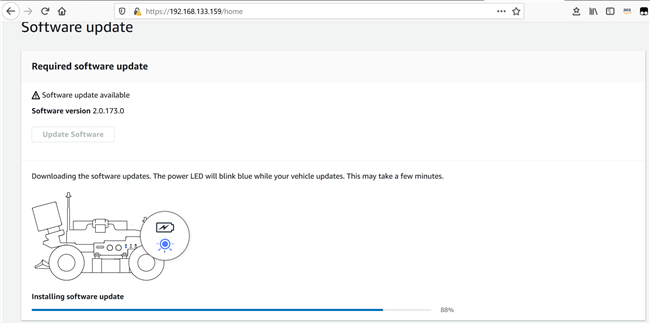 按 RESET 键重启赛车,通过个人电脑浏览器以 IP 地址登陆赛车控制台。看到软件升级提示界面后,点击 “Update Software”, 通常升级进度条会停止在 88%, 进入步骤六。