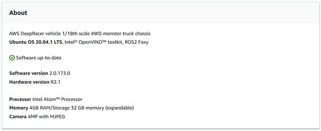 在我们中国 Amazon DeepRacer 实体车竞赛交付经验中,新采购赛车如果内置 2.0.113.0 版本,会与某些过往训练好的在实体赛道中运行良好的赛车模型工作不匹配,模型运行效果比较差,这里需要将赛车软件升级到 2.0.173.0。此操作步骤也适用于基于其它目的的版本升级。