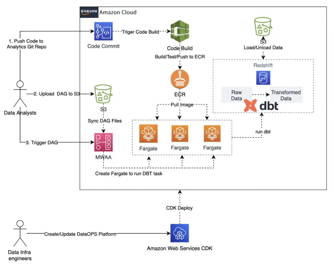 Redshift 集群 CodeCommit, CodeBuild,用于构建 Data Analysts 开发的 DBT 工程的持续集成流程 ECR,用于存放管理 Data Analysts 开发的 DBT 工程的 Docker Image MWAA,用于供数据开发人员调度 DBT 任务的 Airflow 集群 ECS Cluster, 用于运行 DBT Task