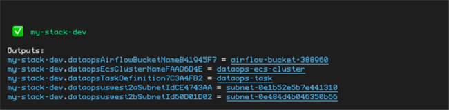 npm install -g yarnnpm install -g npxgit clone https://github.com/readybuilderone/elt-dbt-redshift-demo-for-data-engineer.gitcd elt-dbt-redshift-demo-for-data-engineernpx projennpx cdk bootstrap aws://<ACCOUNT-NUMBER>/<REGION> --profile <YOUR-PROFILE>npx cdk deploy --profile <YOUR-PROFILE>存放 Airflow Dag 的 S3 Bucket 的名称 ECS Cluster 的名称 ECS Task Definition 名称 Redshift 的所在的 Subnet 的 ID