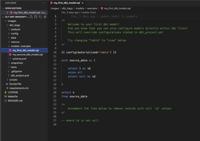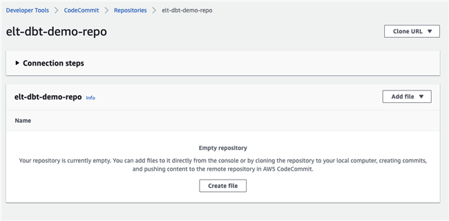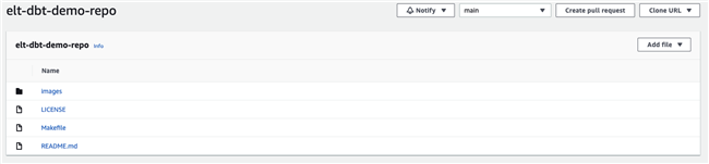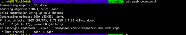 git clone https://github.com/readybuilderone/elt-dbt-redshift-demo-for-data-analysts.gitcd elt-dbt-redshift-demo-for-data-analystsgit remote -vgit remote add codecommit <YOUR-CODECOMMIT-SSH-ADDRESS>git push codecommit