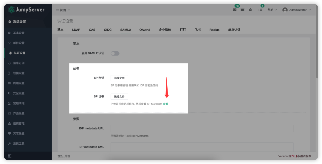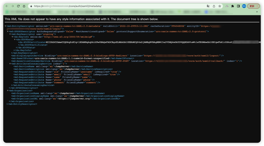 14. 切换至JumpServer页面,打开SAML2认证,将新弹出的会话窗口页面的浏览器地址栏中的地址复制到JumpServer的IDP metadata URL中,点击“提交”按钮,即可完成配置。