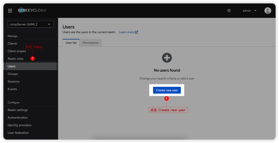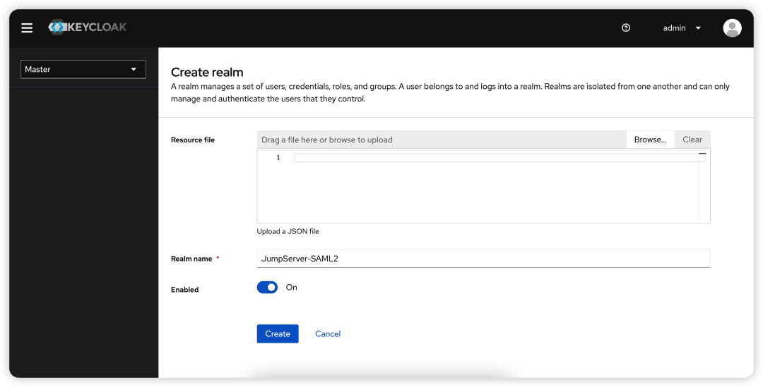 3. 进入到部署好的Keycloak服务控制台,创建一个新的Realm,并自定义名称,这里我们命名为“JumpServer-SAML2”;