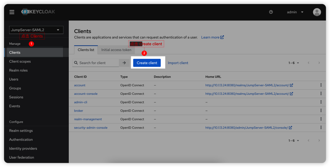5. 根据页面提示,将必须填写的信息填入到对应的选项即可。Client type选择“SAML”,Client ID填入:http[s]://host:ip/core/auth/saml2/login/,域名更换成自己JumpServer下的域名或者IP,点击下方“Save”按钮保存;
