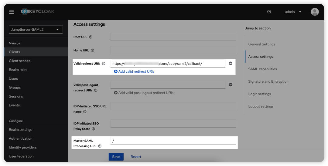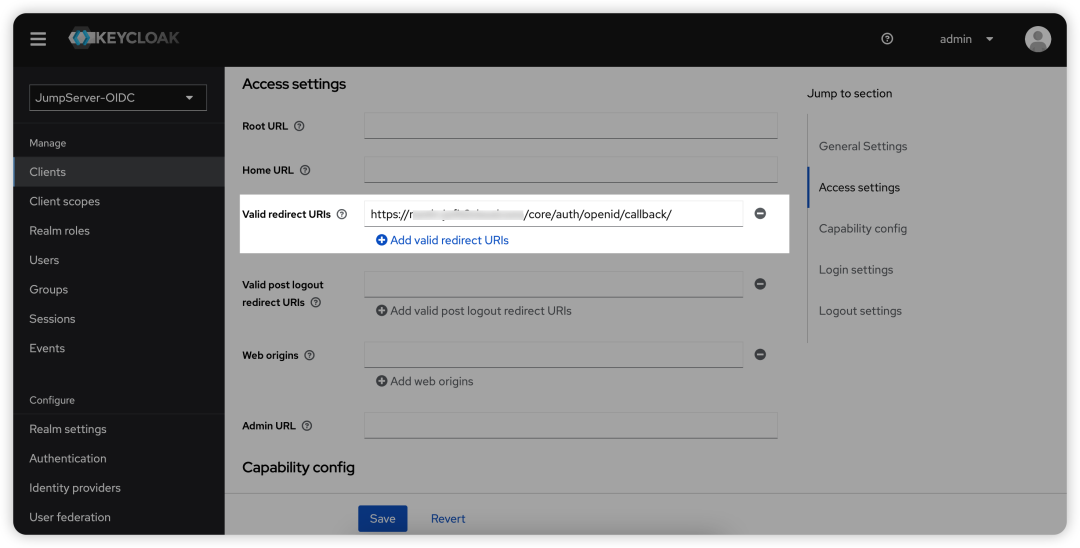 6. 创建完Client后,在Access settings栏修改配置,域名更换为自己JumpServer下的域名或者IP,点击下方“Save”按钮保存;