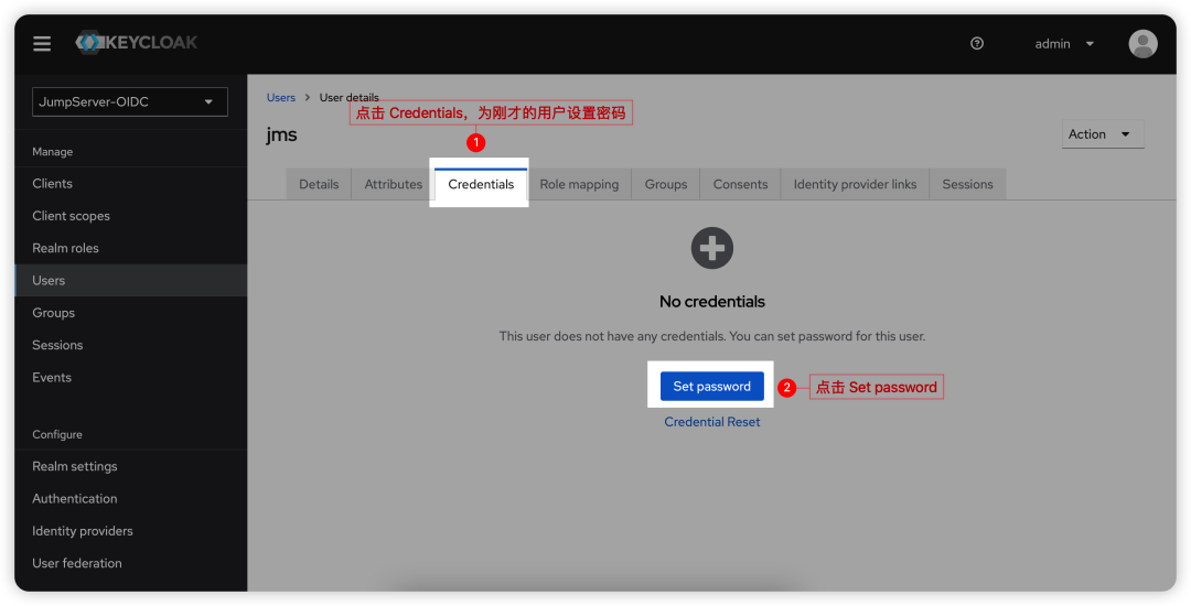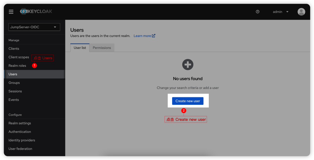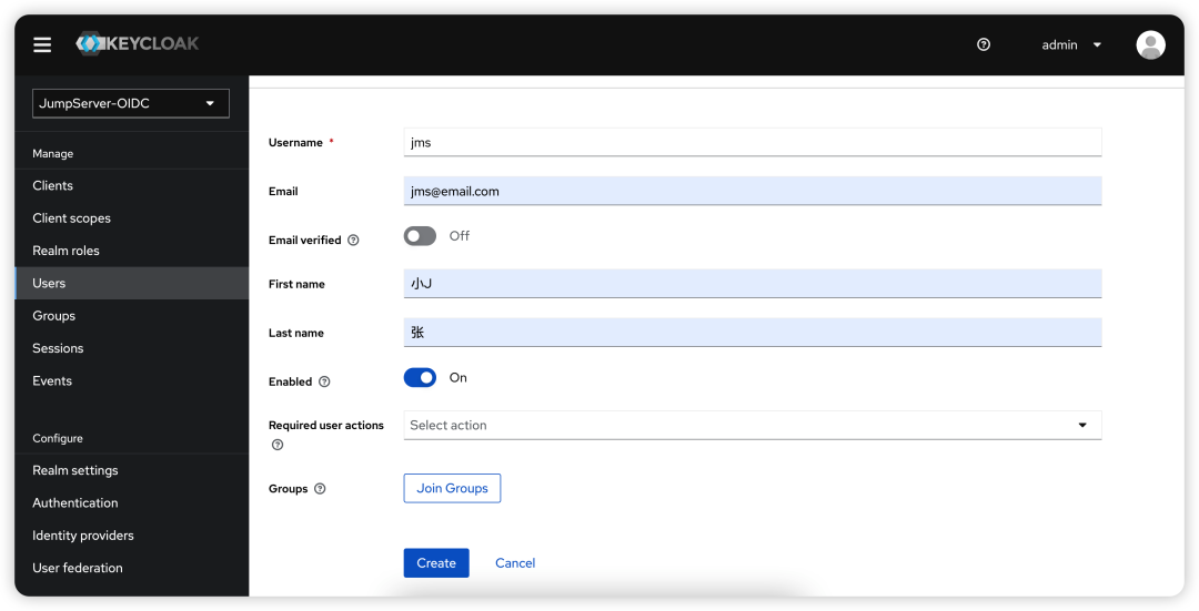 1. 进入到部署好的Keycloak服务控制台,创建一个新的Realm,并自定义名称,这里我们命名为“JumpServer-OIDC”;