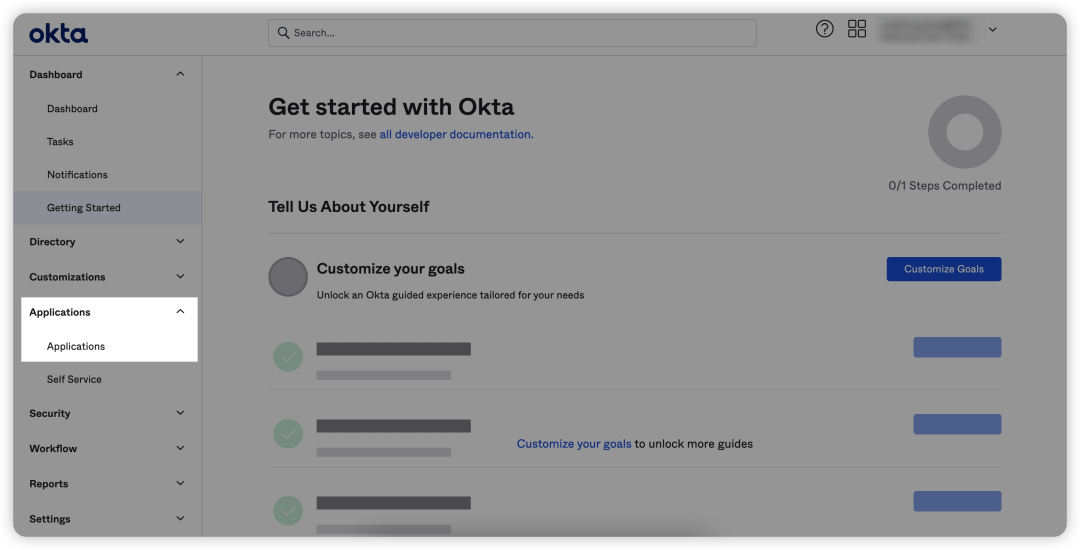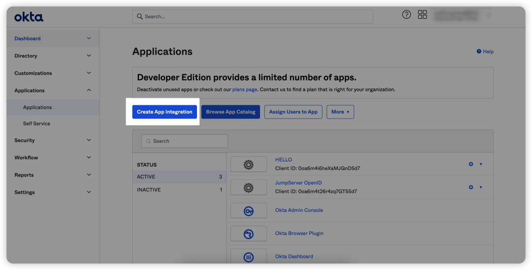 1. 通过官网进入到Okta平台首页后,点击左边菜单栏中的“Applications”→“Applications”;