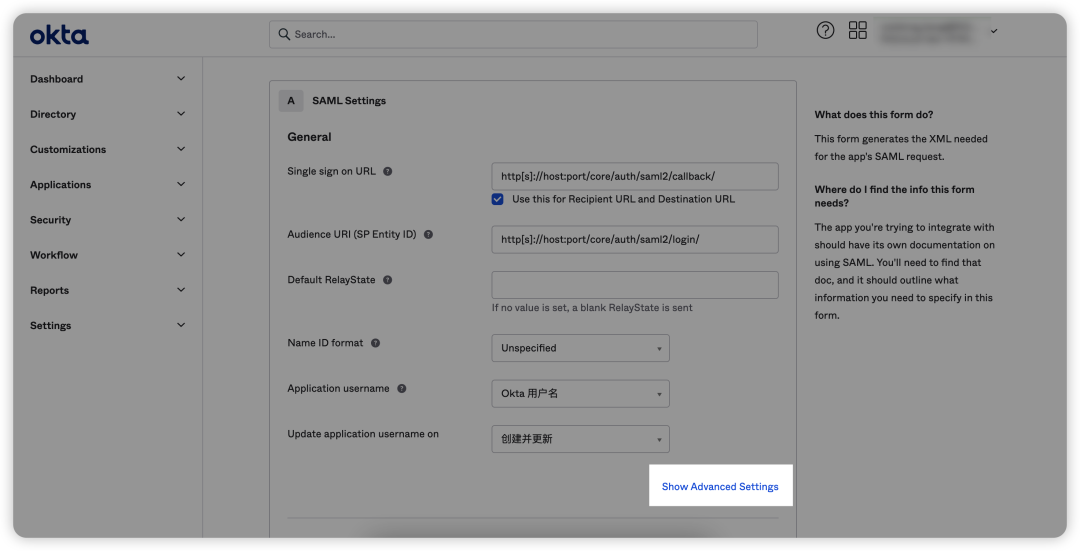 Single sign on URL(即Okta认证成功的回调地址):http[s]://host:port/core/auth/saml2/callback/;