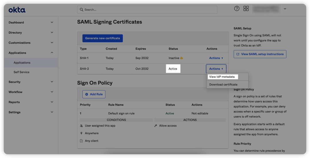 9. 创建应用成功后,在应用界面找到“SAML Signing Certificates”选项卡,选择状态为“Active”的记录,在“Action”菜单中点击“View IdP metadata”选项;
