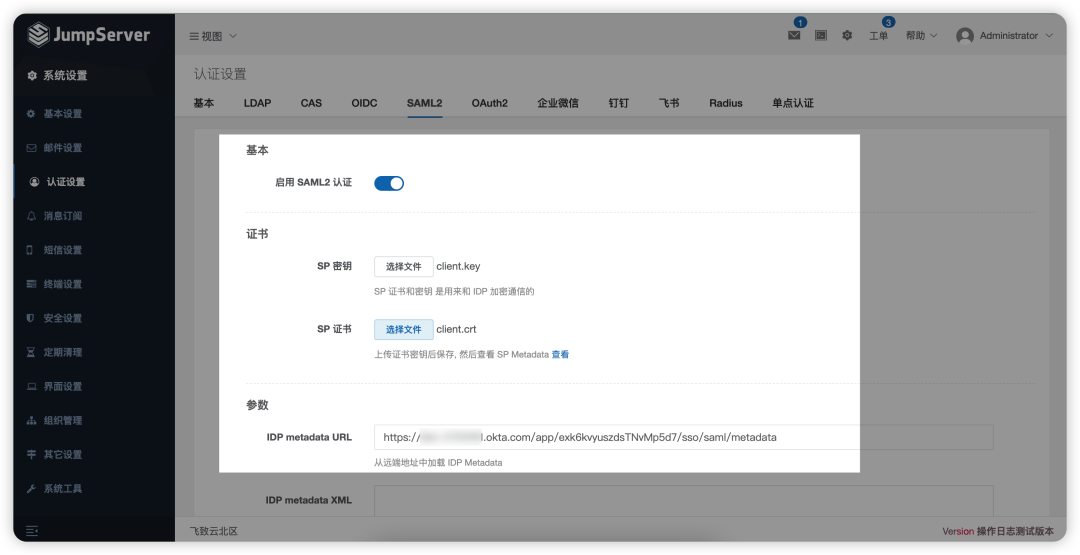 2. 将对接Okta端操作中的第6步(若上述第6步跳过,则返回第6步生成密钥证书部分,执行命令获取证书)生成的密钥证书上传到JumpServer堡垒机,并把第10步生成的URL地址,填写在“IDP metadata URL”中,即可完成JumpServer端的配置。