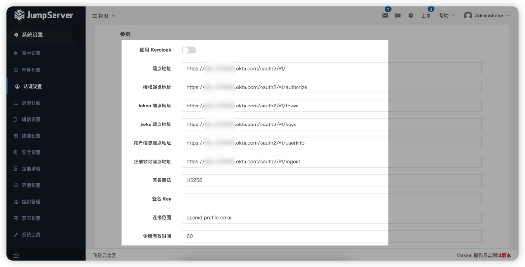 1. 登录JumpServer后,选择“设置”→“认证设置”→“OIDC”,并根据下图填入相应参数,域名处更换为自己的Okta域名;
