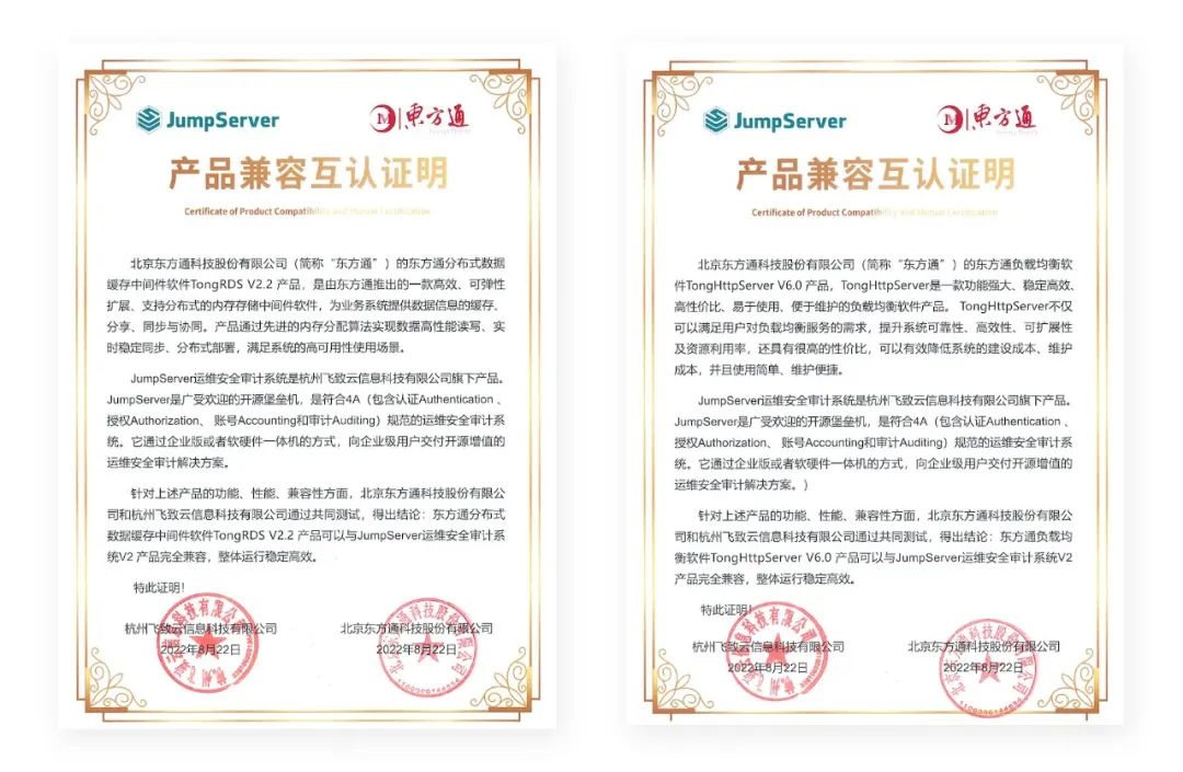 2022年9月13日,多云时代技术领先的企业级软件提供商FIT2CLOUD飞致云宣布,其旗下的CloudExplorer多云管理平台和JumpServer开源堡垒机已经完成与东方通相关软件产品的兼容性认证。