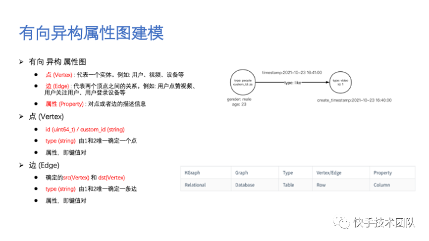 KGraph基于有向异构属性图建模,如上图右侧,一个代表人的节点指向了代表视频的节点,边类型是点赞。