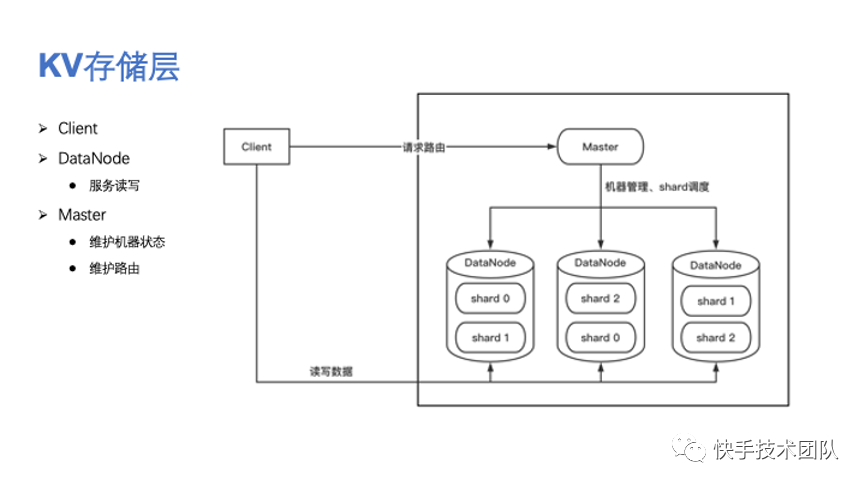对于KV存储层,集群包含三种角色:client,Master和DataNode。