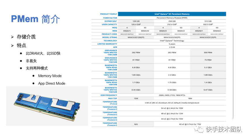 在存储介质层面,目前NVME SSD已经大规模商用,但是我们知道,普通NVME SSD硬盘的吞吐一般在百万IOPS,远小于我们期待的千万IOPS,为了让存储介质层面不成为我们的瓶颈,加上我司已经采购了Intel的PMem,所以我们享受了新硬件的红利。