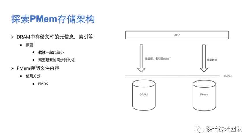 设计思路是在DRAM中存储文件的元信息,索引等,一是这部分数据一般比较小,二是需要频繁的同步持久化;文件的内容存储在PMem中,可以发挥PMem大容量的优势,同时它也具有不错的读写吞吐,使用方式是使用PMDK,通过mmap文件到用户空间,然后按照内存接口操作。