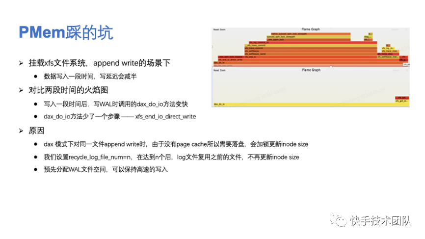 因为能稳定复现,所以我们对比了两段时间的火焰图,定位到一个函数;在写入一段时间后,LSM-Tree写WAL时调用的dax_do_io变快了,在dax_do_io上,发现他直接缺少了一个函数调用,就是xfs_end_io_direct_write。