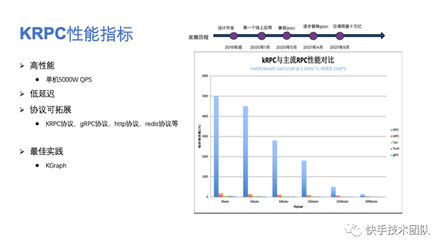KRPC还是一个比较年轻的系统,从2019年底设计开发,到目前KRPC的日均调用量超过十万亿,当前KRPC处于一个快速迭代,功能完善的阶段;其和主流RPC的一个性能对比如图,可以看到KRPC单机5000W的性能有数量级的优势;他的最佳实践就是KGraph。