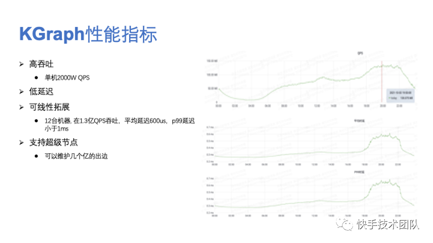 可以看到线上的某个集群数据,12台机器组成的集群, 在1.3亿QPS吞吐下,平均延迟600us,p999延迟小于1ms;在快手某些官方账号上,拥有几个亿的出边,KGraph也支持维护。