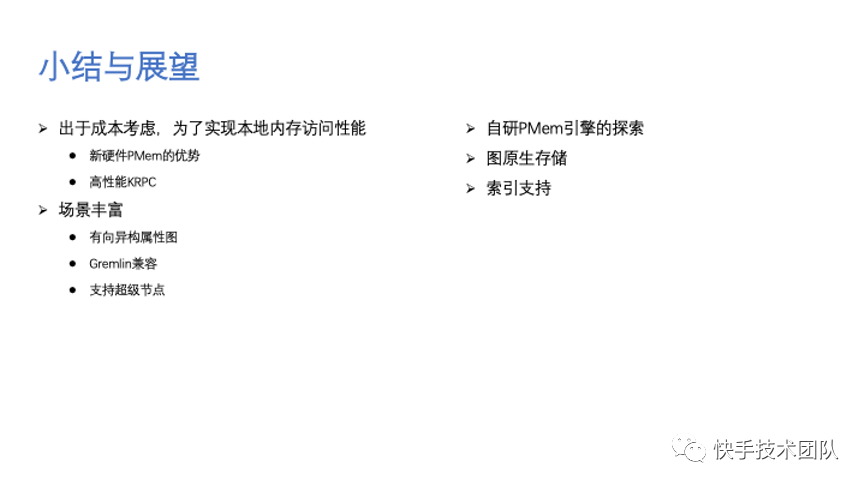 目前KGraph仍然处于快速发展阶段,为了充分发挥PMem的优势,我们还在对自研PMem存储引擎进行探索,对图原生存储以及索引的支持,目前也在探索当中。