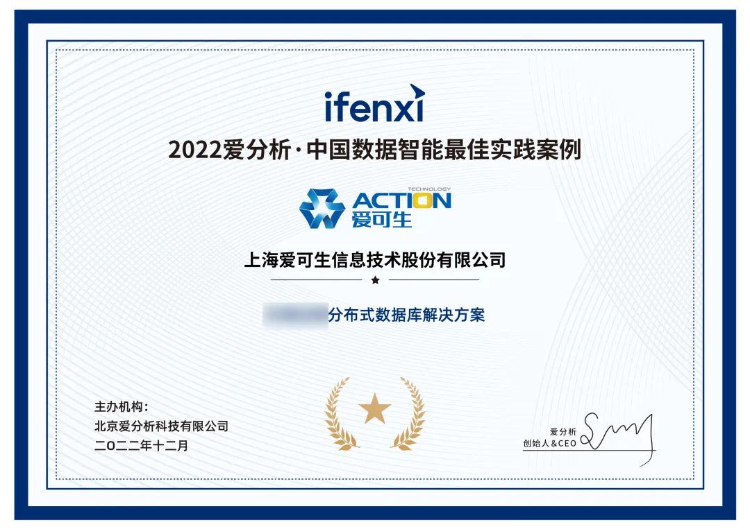近日,“2022爱分析·中国数据智能最佳实践案例”评选征集活动落下帷幕,爱可生携手某证券股份有限公司共同合作的分布式数据库解决方案,成功获评“2022中国数据智能最佳实践案例”。