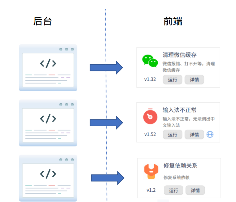 UDOM工具箱最核心的特点,是后台编写运维脚本,前端能够一键执行。在此基础上,后台新增/修改的脚本,前端能够采用自动刷新/导入的方式及时同步。在实际的运维工作中可以动态去增加运维脚本给客户使用,不仅可以统一和规范问题的处理方式,也能避免让客户敲过多命令的问题。
