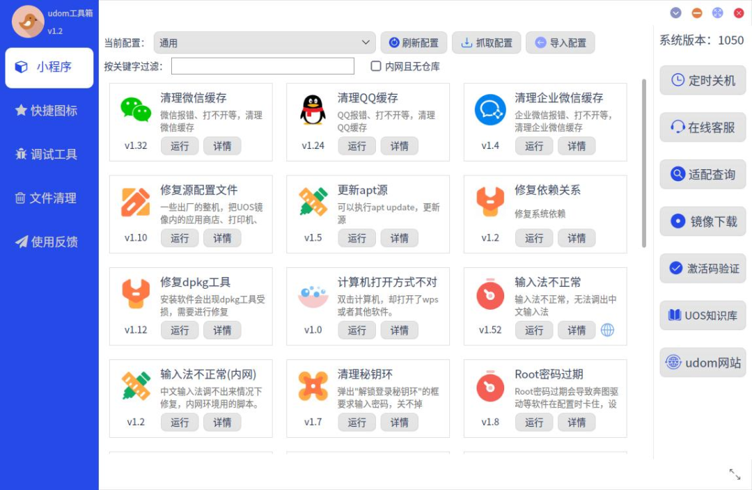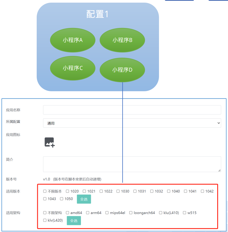 UDOM中的每一个小程序(即运维脚本),都能指定适用的系统版本和硬件架构,在前端抓取配置时,如果前端的环境不符合小程序的适用要求,该小程序将不显示。UDOM能够提供灵活的定制能力,可以为某个地市的所有客户定义一套配置,也可以单独为某个客户单位定义一套配置。