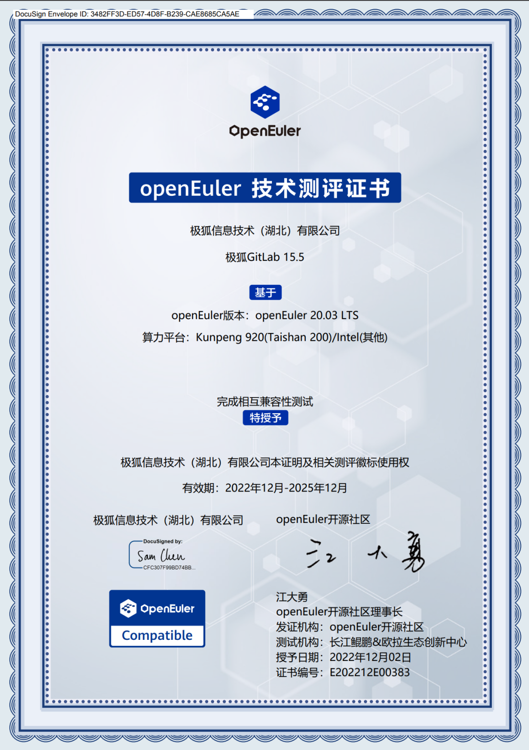 近日,极狐GitLab 与欧拉开源操作系统(openEuler,简称“欧拉”)完成相互兼容性测试认证,并取得 openEuler 技术测评证书及徽标使用权。这是极狐GitLab 继与华为鲲鹏 920 完成兼容认证后,在自主创新发展之路上再次迈进坚实一步。