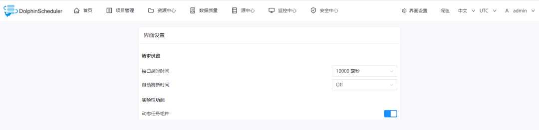 增加系统设置页面(该页面目前包含接口默认请求的超时时间配置和日志接口轮询的时间间隔配置),在页面中增加实验性功能配置,其中包含动态任务组件的开关选项(当开关打开时,会在工作流定义页面中出现一个创建工作流(动态)的黄色按钮,点击后跳转新的画布页面);