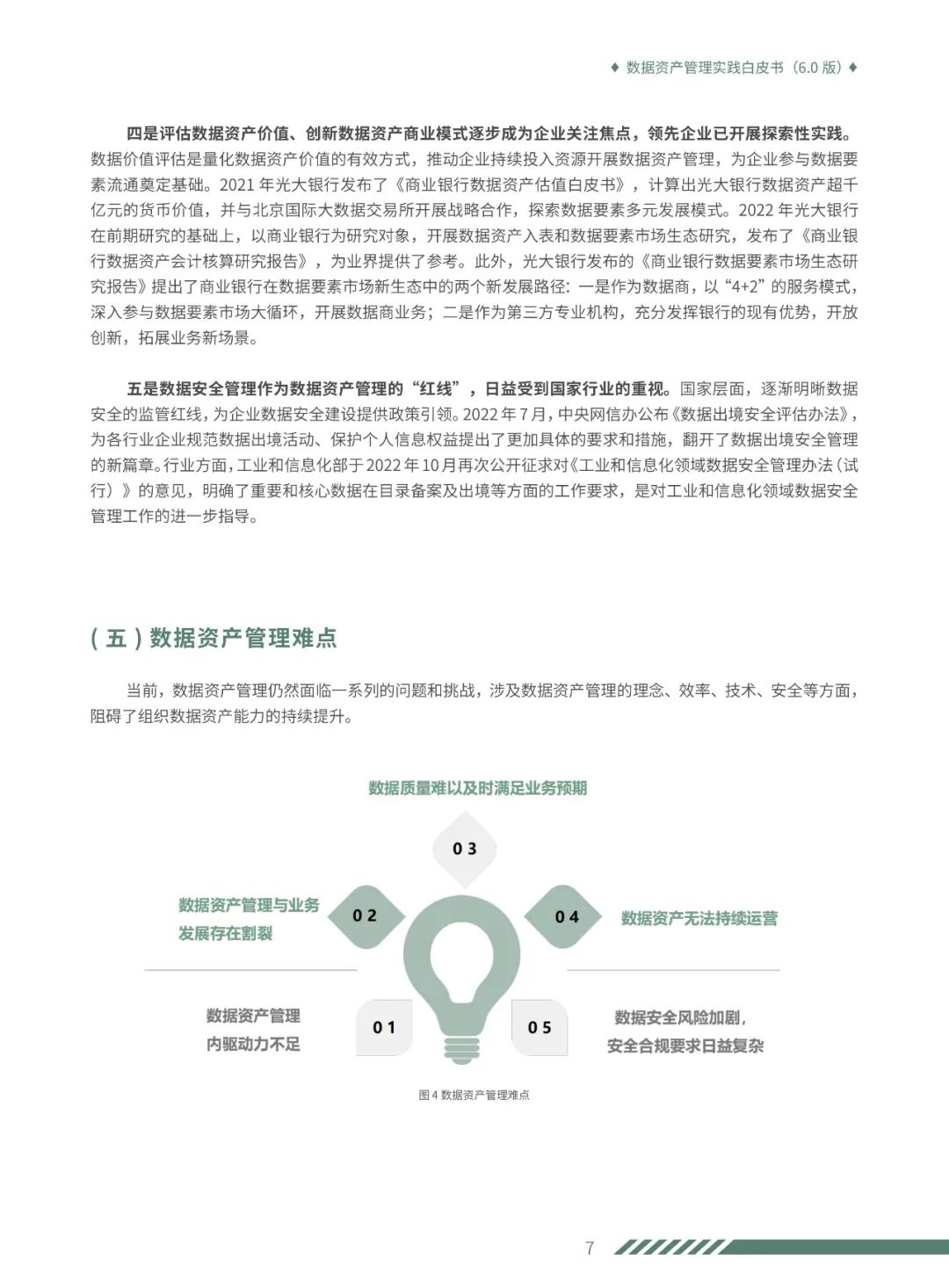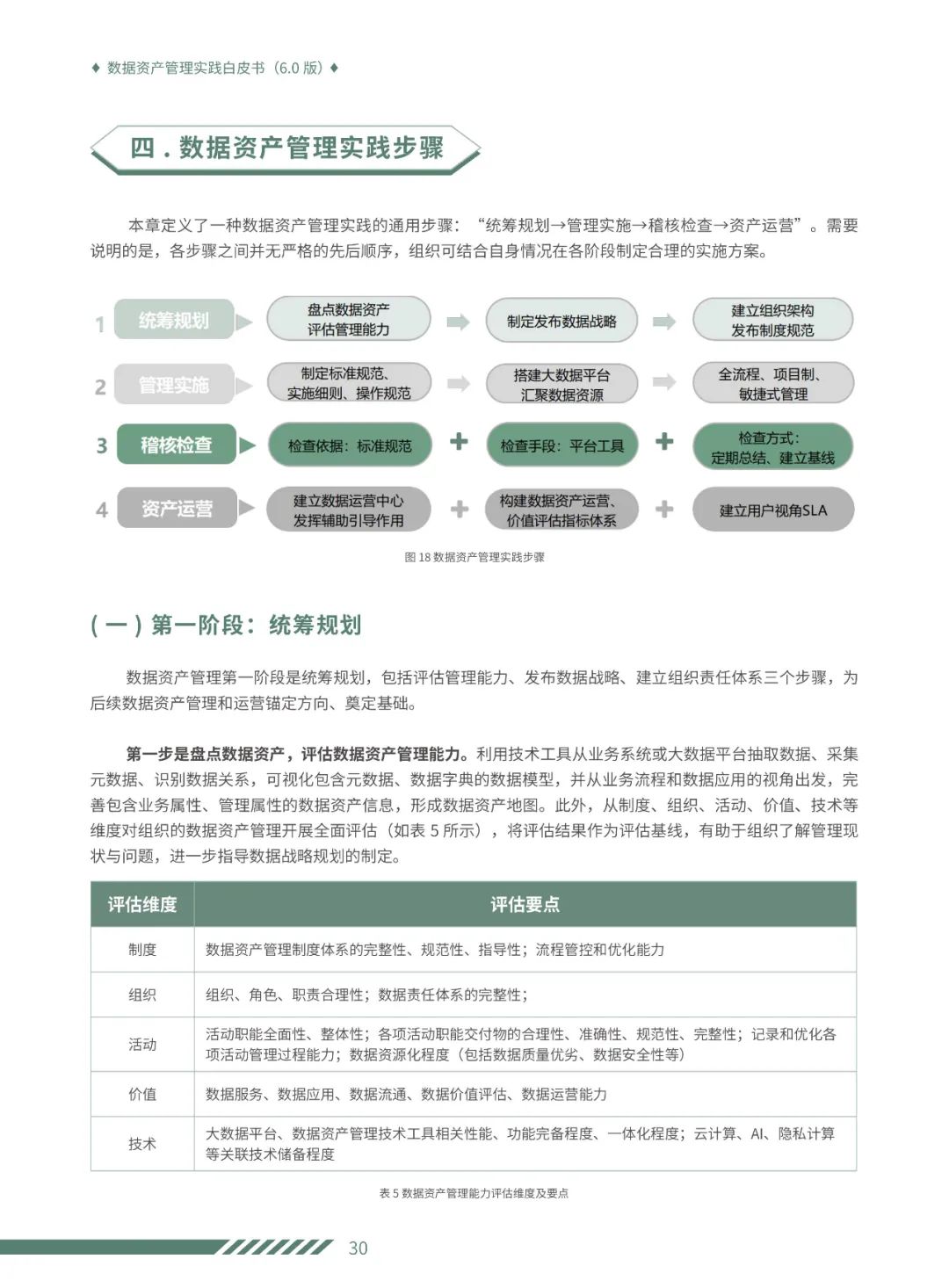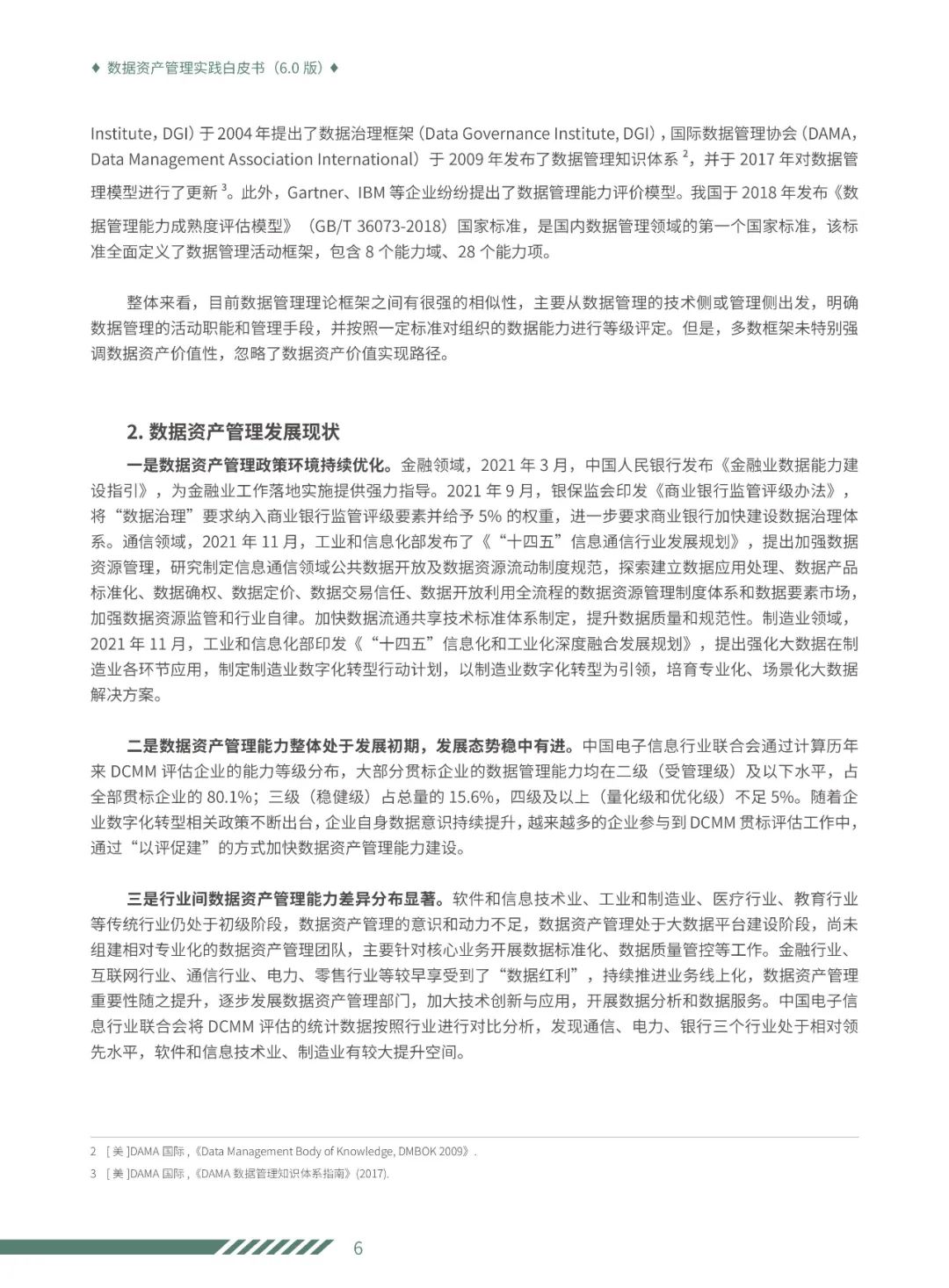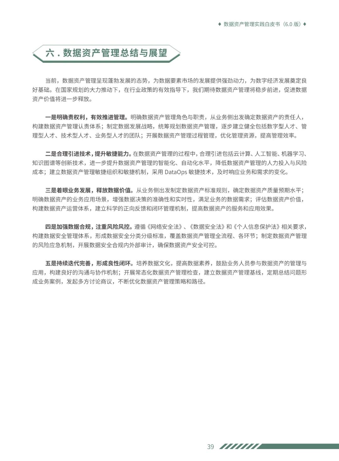 《数据资产管理实践白皮书(6.0版)》在《数据资产管理实践白皮书(5.0版)》的基础上,结合2022年数据资产管理领域政策和行业动向,持续跟踪各行业典型方法和实践案例,更新了数据资产管理的理念和方法,对数据资产管理领域的发展现状和趋势进行了总结,有助于企业了解自身所处的发展阶段,更好的拟定下一步建设思路。