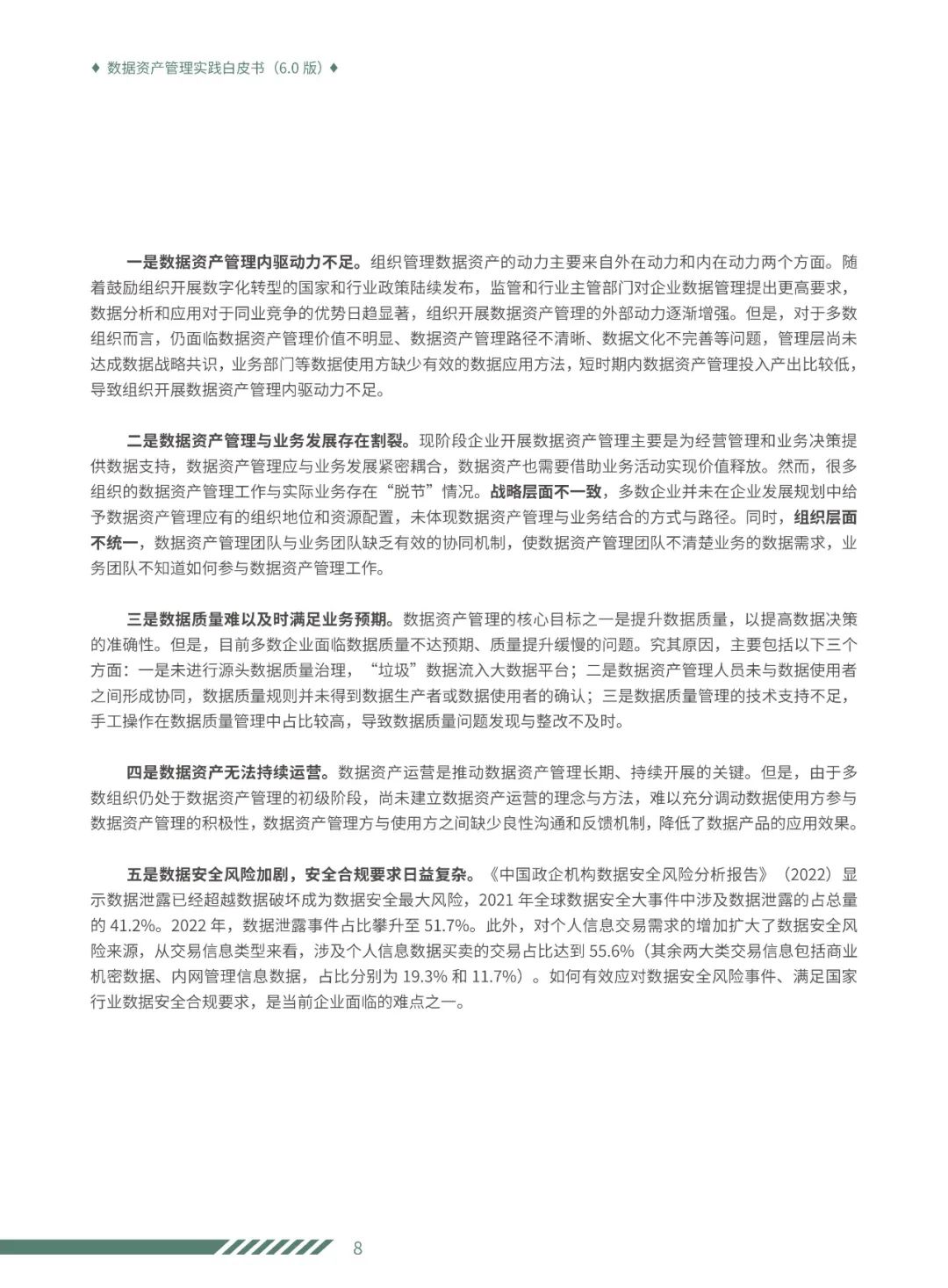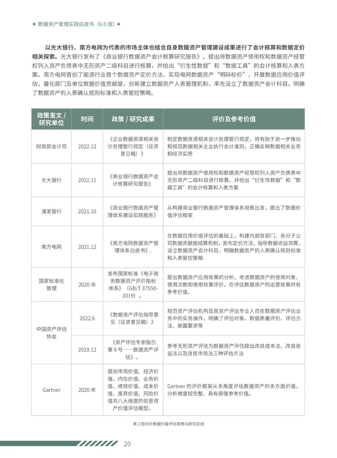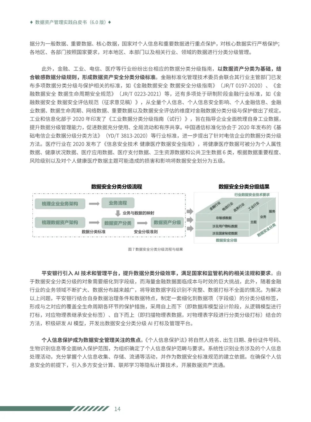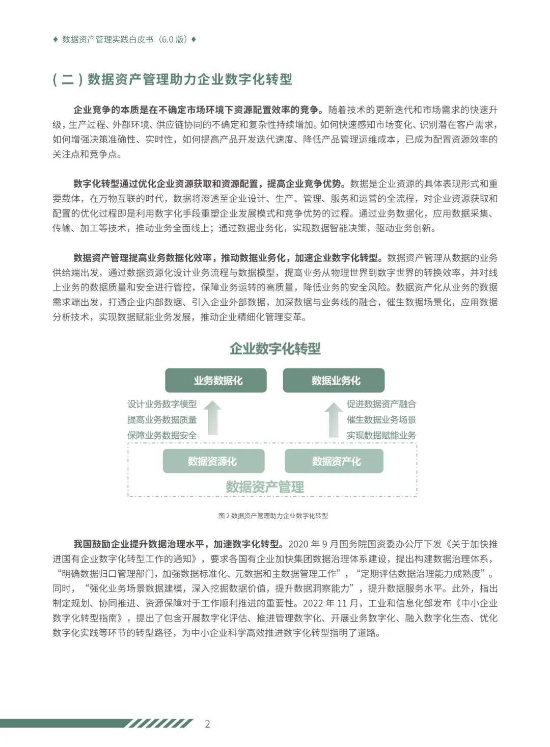 《数据资产管理实践白皮书(6.0版)》在《数据资产管理实践白皮书(5.0版)》的基础上,结合2022年数据资产管理领域政策和行业动向,持续跟踪各行业典型方法和实践案例,更新了数据资产管理的理念和方法,对数据资产管理领域的发展现状和趋势进行了总结,有助于企业了解自身所处的发展阶段,更好的拟定下一步建设思路。