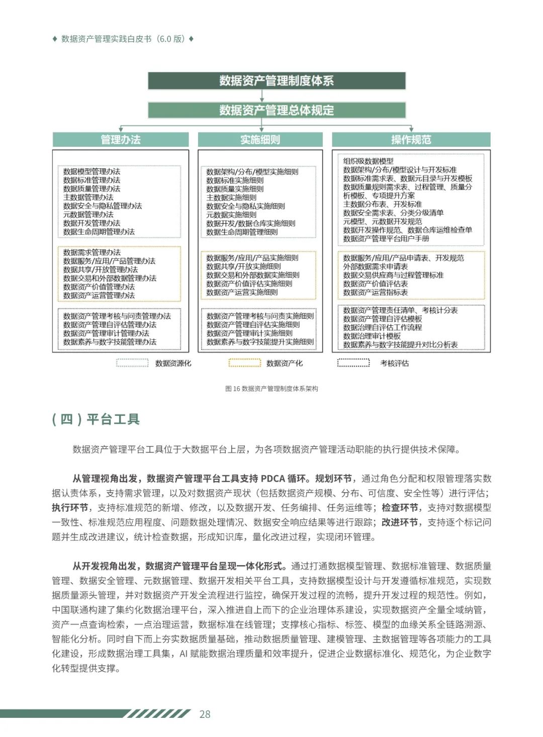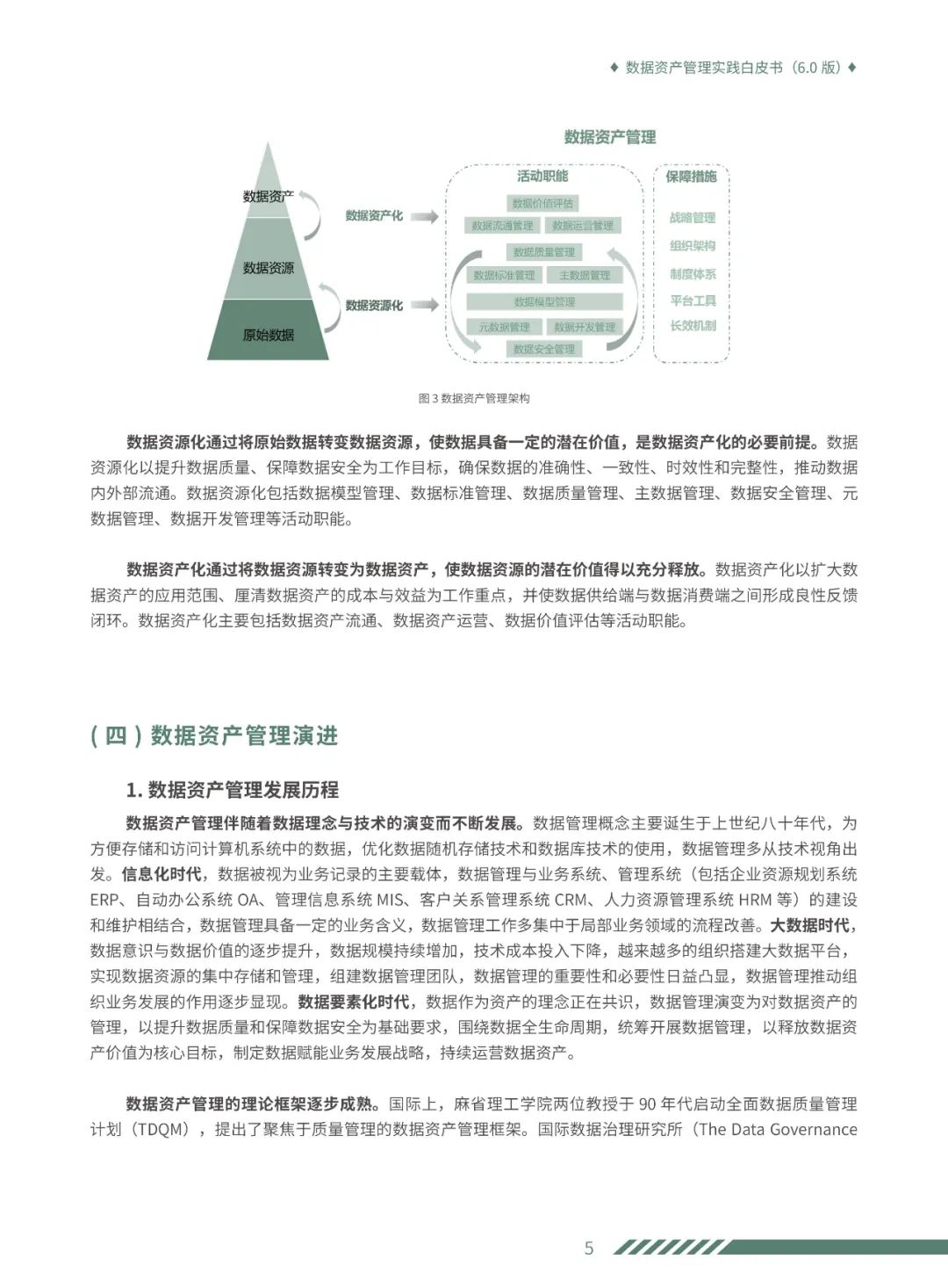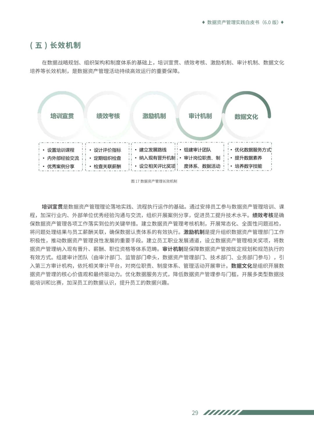 为指导企业解决以上问题,本白皮书总结了数据资产管理活动职能的核心理念与实践要点,提出了战略规划、组织架构、制度体系、平台工具、长效机制五大数据资产管理保障措施,提倡企业体系化开展数据资产管理工作,提升数据资源化效率,创新数据资产化模式,引导企业充分融入数据要素市场发展,加速数据资产价值释放。