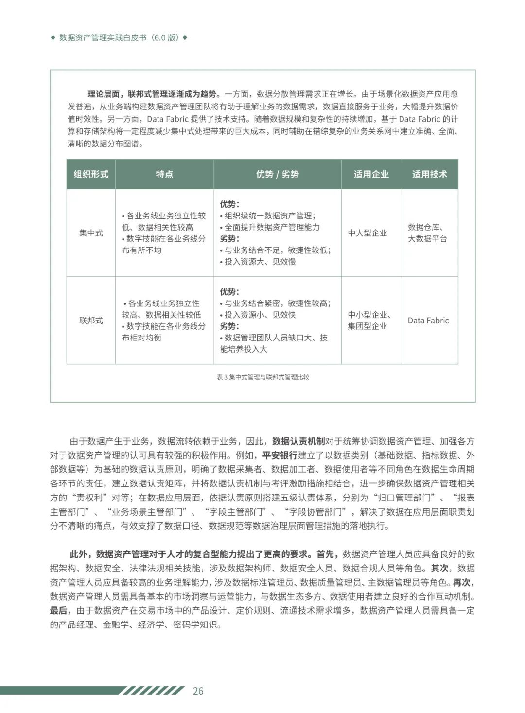 明确责权利,有效推进管理。明确数据资产管理角色与职责,从业务侧出发确定数据资产的责任人,构建数据资产管理认责体系;制定数据发展战略,统筹规划数据资产管理,逐步建立健全包括数字型人才、管理型人才、技术型人才、业务型人才的团队;开展数据资产管理过程管理,优化管理资源,提高管理效率。