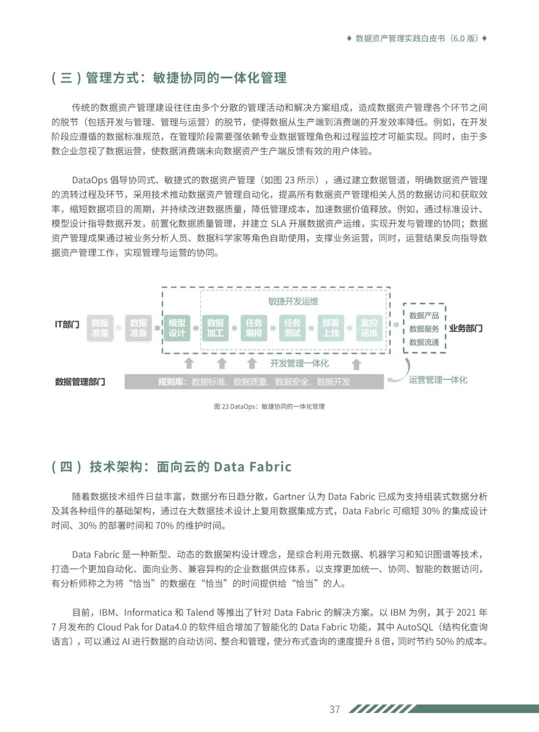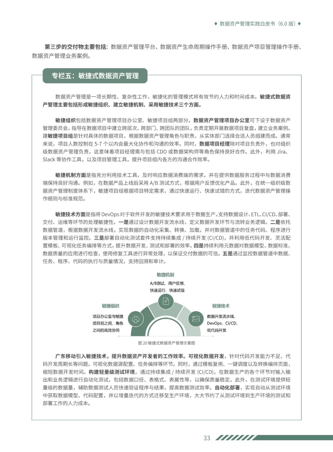 合理引进技术,提升敏捷能力。在数据资产管理的过程中,合理引进包括云计算、人工智能、机器学习、知识图谱等创新技术,进一步提升数据资产管理的智能化、自动化水平,降低数据资产管理的人力投入与风险成本;建立数据资产管理敏捷组织和敏捷机制,采用 DataOps 敏捷技术,及时响应业务和需求的变化。